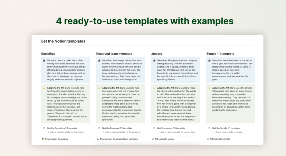 ➡️ 4 templates for 1:1s (I divided characters in 4 different types, based on my observation on how people act during 1:1s -> Socialites, Reserved, Junior or Classic)