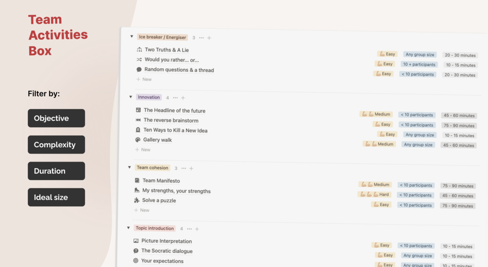Introducing the Team Activities Box for Notion, a comprehensive system designed to inspire and streamline your team-building efforts directly within Notion. Perfect for managers who want to leverage the power of Notion to foster collaboration, enhance decision-making, and solve problems effectively.