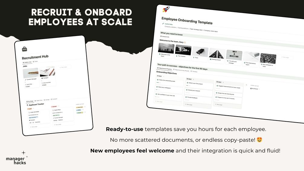 - Onboarding & Offboarding Dashboards: Step-by-step checklists and OKR templates to welcome new hires or ensure smooth departures.