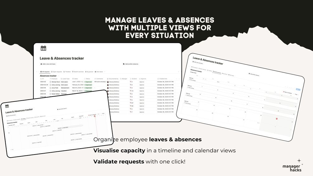 - Manage Absences: Use the Leave & Absence Tracker to approve, manage, and track employee absences.