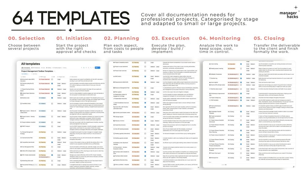 🔗 Over 60 essential templates: From project charters and risk matrices to communication plans and KPIs trackers, everything you need to manage projects like a pro.