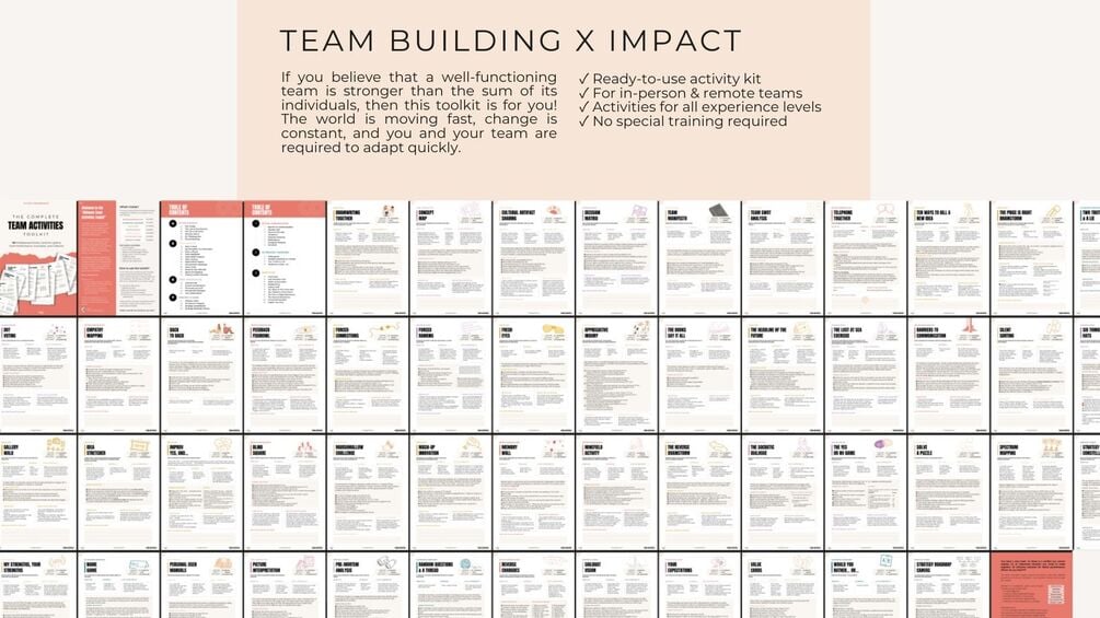 Inside the Team Activities Toolkit you will find 50 creative, ready-to-use activities with detailed explanations to put the energy back into your meetings, have productive conversations, solve real problems and get more engagement from your team. It's perfect for boosting your confidence, encouraging collaboration, and you can even adapt it to remote or face-to-face teams. Get it today and see your team transform!