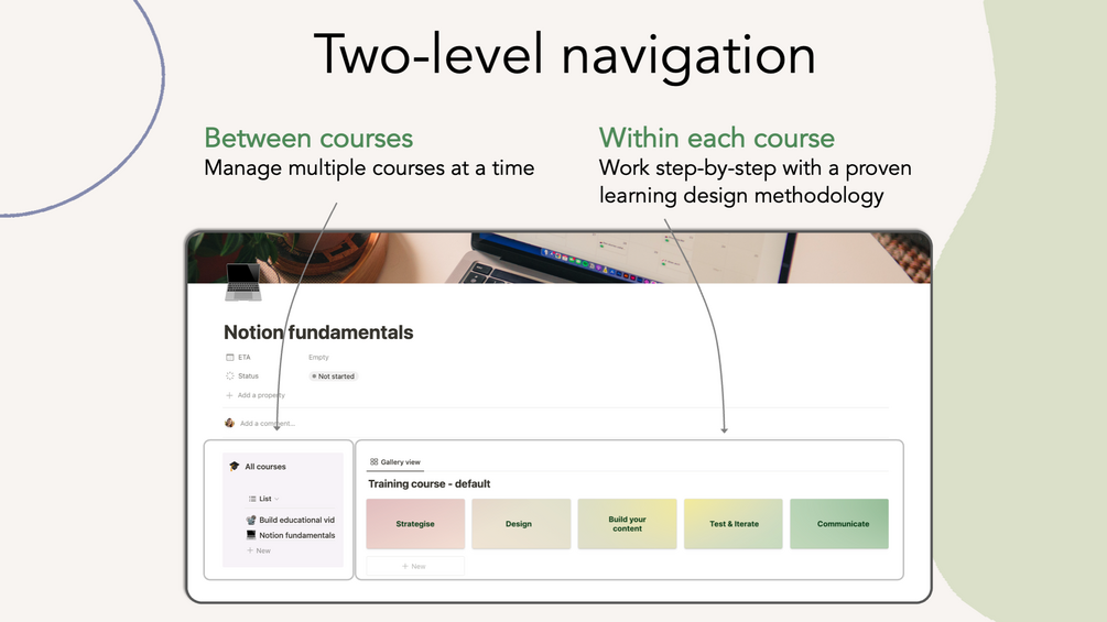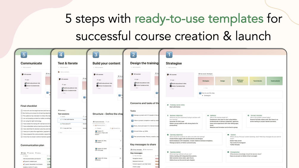 Each step comes with ready-to-use databases and templates, guiding you thrugh the course creation process step by step.